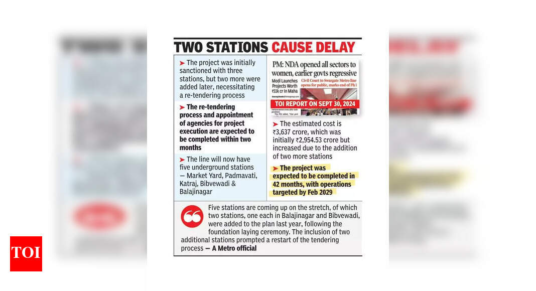 पुणे-पंतप्रधान नरेंद्र मोदींनी 5.5 कि.मी. भूमिगत स्वर्गेट-कटराज मेट्रो प्रकल्पासाठी पायाभूत दगड अक्षरशः ठेवल्यानंतर एक वर्षानंतर, प्रवासी अजूनही वास्तविक मैदानाच्या सुरूवातीच्या प्रतीक्षेत आहेत. अधिका officials ्यांचा असा अंदाज आहे की बांधकाम सुरू होण्यापूर्वी आवश्यक औपचारिकता पूर्ण करण्यास आणखी दोन महिने लागू शकतात.गेल्या वर्षी २ Sep सप्टेंबर रोजी पंतप्रधानांनी या प्रकल्पाचा पाया घातला होता. तेव्हापासून मेट्रो अधिकारी या योजनेवर काम करत आहेत. “पाच स्टेशन स्ट्रेचवर येत आहेत, त्यापैकी दोन स्थानके, बालाजीनगर आणि बिबवेवाडी येथील प्रत्येकी एक, फाउंडेशनच्या सोहळ्यानंतर गेल्या वर्षी या योजनेत जोडली गेली होती. दोन अतिरिक्त स्थानकांच्या समावेशामुळे निविदा प्रक्रिया पुन्हा सुरू करण्यास प्रवृत्त केले, ”मेट्रोच्या एका अधिका said ्याने सांगितले.स्वारगेट-कटराज स्ट्रेचवरील प्रवाश्यांनी बांधकाम सुरू होण्यास उशीर झाल्याबद्दल निराशा व्यक्त केली आहे, कारण यामुळे या प्रकल्पाचे पूर्णता पुढे ढकलले जाईल या भीतीने. कात्राज ते खडकि पर्यंतचे नियमित प्रवासी अनुप सतव म्हणाले की मेट्रोचे काम आधीच हळूहळू प्रगती होत आहे आणि कोणताही विलंब अस्वीकार्य होता. ते म्हणाले, “पीएमपीएमएल बस स्वारगेट-कटराज मार्गावर कार्यरत असताना मेट्रोने पिंपरीला थेट कनेक्टिव्हिटी दिली असती आणि अधिक कार्यक्षम पर्याय दिला असता,” ते म्हणाले.स्वारगेट-कटराज मेट्रो विस्तार महा मेट्रोद्वारे लागू केले जात आहे, जे बांधकाम पार पाडण्यासाठी एजन्सी नियुक्त करण्याच्या अंतिम टप्प्यात आहे. अधिका said ्यांनी सांगितले की अंमलबजावणीची योजना जवळजवळ अंतिम झाली असताना काही तांत्रिक बाबी अद्याप प्रलंबित आहेत. “विद्यमान स्वारगेट भूमिगत स्थानकाच्या पलीकडे, कटराजच्या दिशेने जाणा Tw ्या दुहेरी बोगदे बांधले जातील,” असे दुसर्‍या अधिका said ्याने सांगितले.दोन नवीन स्थानकांच्या समावेशामुळे प्रकल्पाची किंमत 3,637 कोटी रुपये झाली आहे. पीएमसी, राज्य आणि केंद्रीय सरकार आणि वित्तीय संस्थांमध्ये हा निधी सामायिक केला जाईल. स्वारगेटच्या मेट्रो सर्व्हिसेस आधीच सुरू झाली आहे, गेल्या वर्षी 29 सप्टेंबर रोजी स्वारगेट स्टेशन सुरू झाले आहे. स्वारगेट मेट्रो स्टेशनमधील प्रवाश्यांनी सुविधांमध्ये वाढ करण्याची मागणी केली आहे. मुख्य चिंतेमध्ये अतिरिक्त प्रवेश आणि निर्गमन बिंदू आणि समर्पित पार्किंग सुविधांचा समावेश आहे. स्टेशन उघडल्यापासून सध्या फक्त जेदी चौक प्रवेश-एक्झिट कार्यरत आहे, तर गणेश काला क्रिडा मंच जवळील एक प्रवेश करण्यायोग्य आहे. शिवाय, मेट्रो स्टेशनला स्वारगेट एमएसआरटीसी बस टर्मिनसशी जोडणारी सबवे अद्याप अपूर्ण आहे.