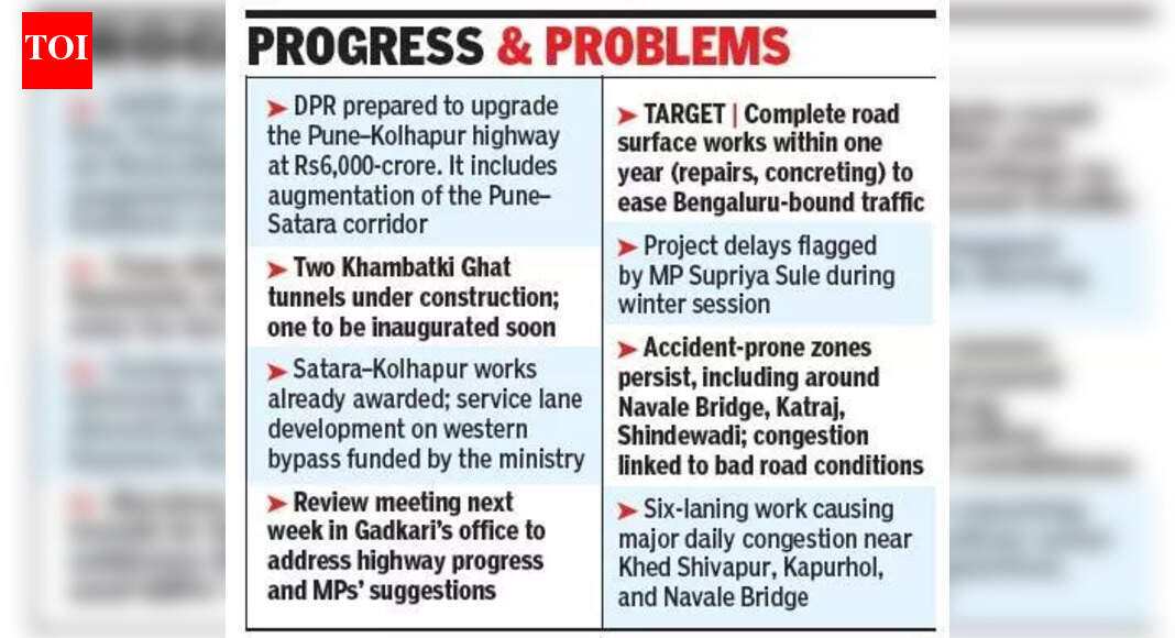 पुणे: केंद्रीय रस्ते वाहतूक आणि महामार्ग मंत्री नितीन गडकरी यांनी गुरुवारी सांगितले की, मंत्रालयाने सध्याचा पुणे-कोल्हापूर महामार्ग सुधारण्यासाठी 6,000 कोटी रुपये खर्चून सविस्तर प्रकल्प अहवाल (डीपीआर) तयार केला आहे. पुणे-सातारा कॉरिडॉरच्या विस्तारीकरणाचाही या योजनेत समावेश आहे.हिवाळी अधिवेशनात बारामतीच्या खासदार सुप्रिया सुळे यांनी विचारलेल्या प्रश्नाला ते उत्तर देत होते.“सरकार डीपीआरची अंमलबजावणी सुरू करणार आहे. साताऱ्याजवळील खंबाटकी घाटाजवळ दोन बोगद्यांचे काम सुरू आहे. त्यातील एका बोगद्याचे लवकरच उद्घाटन होणार आहे,” ते म्हणाले. “महामार्ग अत्यंत महत्त्वाचा आहे आणि मंत्रालय या प्रकल्पाचा पुन्हा अभ्यास करत आहे. आम्ही पश्चिम बायपासच्या सर्व्हिस लेन विकसित करण्यासाठी मंत्रालयाचा निधी वापरत आहोत. सातारा ते कोल्हापूर दरम्यानच्या कामांना यापूर्वीच पुरस्कार देण्यात आला आहे, असे गडकरी म्हणाले.खासदारांनी दिलेल्या सूचनांसह महामार्ग प्रकल्प आणि संबंधित मुद्द्यांवर अधिक चर्चा करण्यासाठी पुढील आठवड्यात त्यांच्या कार्यालयात आढावा बैठकीचे नियोजन करण्यात आल्याचे त्यांनी सांगितले. बंगळुरूच्या दिशेने जाणाऱ्या प्रवाशांचा त्रास कमी करण्यासाठी रस्त्याच्या पृष्ठभागाची कामे, दुरुस्ती आणि काँक्रिटीकरण इत्यादी कामे एका वर्षात पूर्ण करण्याचे मंत्रालयाचे उद्दिष्ट आहे.दरम्यान, या प्रकल्पाला विलंब होत असल्याचे सुळे यांनी सांगितले. “काही रस्त्यांच्या कंत्राटदारांना काळ्या यादीत टाकले आहे. काम कधी पूर्ण होणार?” ती म्हणाली.पुणे शहरातील नवले पुलासारख्या ठिकाणी अपघातांचे प्रमाण कमी झाले असले तरी अपघातप्रवण भागांची समस्या कायम असून या समस्येतून सुटका करण्यासाठी प्रयत्नांची गरज असल्याचेही सुळे यांनी सांगितले. पुलाच्या आजूबाजूला काळे ठिपके आहेत. “पुणे-सातारा रोडवरील खराब रस्त्यांच्या कामांचा शहरात मोठा परिणाम झाला आहे. शहरातील कात्रज, शिंदेवाडी आणि जवळपासच्या भागांसारख्या बाहेर पडण्याच्या मार्गांवर वाहतूक कोंडी होत आहे,” असे कात्रजचे रहिवासी चिन्मय जोशी यांनी सांगितले. विशेषत: रात्रीच्या वेळी या ठिकाणांहून पुण्यात येणारी अवजड वाहतूक धोक्याची ठरते, असे ते म्हणाले. विशेषत: सर्व भाग अपघात प्रवण बनल्यामुळे या भागांमध्ये स्थानिकांना ये-जा करणे कठीण झाले आहे. “पुणे आणि आजूबाजूच्या परिसरातील अनेक नागरिक पुणे-कोल्हापूर महामार्गापासून दूर असलेल्या वाई आणि महाबळेश्वर सारख्या लोकप्रिय पर्यटन स्थळांना भेट देतात. धार्मिक सहलीसाठी कोल्हापूरला जाणाऱ्या पर्यटकांची संख्याही जास्त आहे. रस्त्यांची कामे अपूर्ण असल्याने सर्वच प्रवाशांचे हाल हो